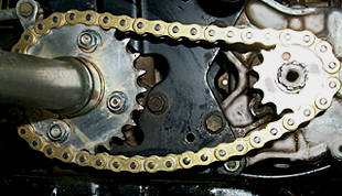 Stock Chain Tension Chain Tension With Tensioner As you know, the good folks at Suzuki did not provide any way of adjusting the chain tension on the LT80 making gear changes nearly impossible to do. Even the stock chain is way too loose which can eventually lead to sprocket wear. While this set-up is generally adequate for mild trail riding, if you are really serious about performance or are a racer, then our new chain tensioner is for you. Features include CNC machined parts from silver 1/4" thick 6061-T6 Billet Aluminum, a high performance nylon ball bearing supported roller, stainless steel hardware and the correct tension spring. Once installed your chain tension worries are over as the roller can now track over 4" of chain movement. This is perfect for you racers who want to be able to change gear ratios and peace of mind for the trail rider as the sprockets will last longer. Tensioner is actually silver, not blue as pictured.