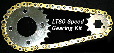 This is the single biggest speed improvement you can make to your LT80 for the dollar. Brand new 3 piece kit to improve the speed of your LT80. Included is a high quality CNC machined 7075-T6 aluminum rear axle sprocket, steel countershaft sprocket and a very high quality gold 428 MX chain. This kit not only increases the top speed but also decreases the rolling resistance with the smaller 428 pitch chain. The stock 520 O-ring chain is far too heavy and has a lot of unnecessary drag which robs horsepower and slows the machine down. Once installed with the new ratio gears, the little LT80 will roll much easier improving acceleration and the revised gear ratio will bump the top speed up about 5mph, making it perfect for trail riding, woods or MX. Easy Installation! Full detailed photo instructions are included.