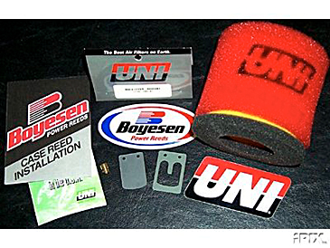 Brand new 3 piece kit to improve the power of your Suzuki LT80 or Kawasaki KFX80. Includes Boyesen 2 stage reeds. These reeds have a lightweight primary reed which opens sooner than a single reed for more bottom and midrange power. Uni-Filter- This is a very high quality free flow 2-stage filter. The 2 stage design filters air better than the stock unit and the outer pre-filter can be removed from the main air filter for quick cleaning to help extend service intervals. A special size main jet is also included to properly lean out the mixture for maximum top end power. This kit will give a nice boost in performance and is easily installed. Also works excellent in conjunction with a pipe. Power-On!