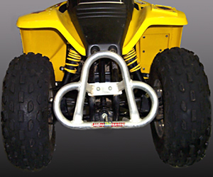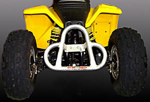 Stock LT80 LT80 With WideRide Announcing our all new WideRide wheel spacer offset kits. As you can see above the stock LT80 is now a full 5" wider at the wheels with a simple bolt-on kit. This lends increased stability to the machine for improved cornering whether trail riding or racing on a track. The front wheel travel is also increased about 1" as well in much the same way as longer A-arms do along with delivering a softer ride. Also works excellent when combined with our Long Travel Front Shocks as it essentially duplicates the effect of +5"A-Arms. WideRide kits consist of high quality CNC machined 4140 steel spacers, clear coated for excellent corrosion resistance and durability. All you have to do is remove your wheel, tighten the spacers on the stock studs and replace the wheel. In just a few minutes you can radically alter the look and ride of your stock machine. The weight and load is equally supported across the hub so it is a very strong system. It has been extensively tested on trails and racing over the past 21 years with no failures whatsoever. Wider is better, so get WideRide today! note: (Two kits are required, one for each end on a stock quad. If you have the wider rear wheels installed, then just order one kit for the front.)
